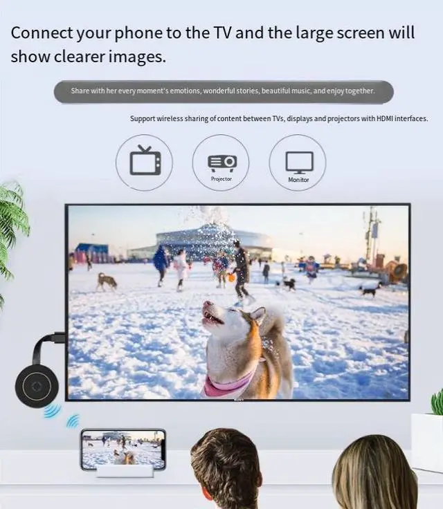Built-in antenna, compatible with various high-compatible devices; supports Android / iPhone / iPad; wide range of applications; supports projectors / monitors / HD and other HDMI devices.