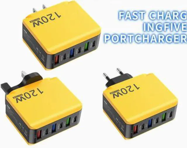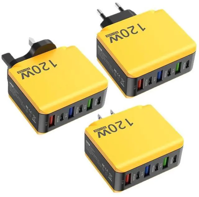 120W 6-Port USB Charger 3 USB-A + 3 Type-C PD Fast Charging Station for iPhone/Samsung/Laptop, Multi-Device Desktop Charger with EU/US/UK Plug Options, Yellow