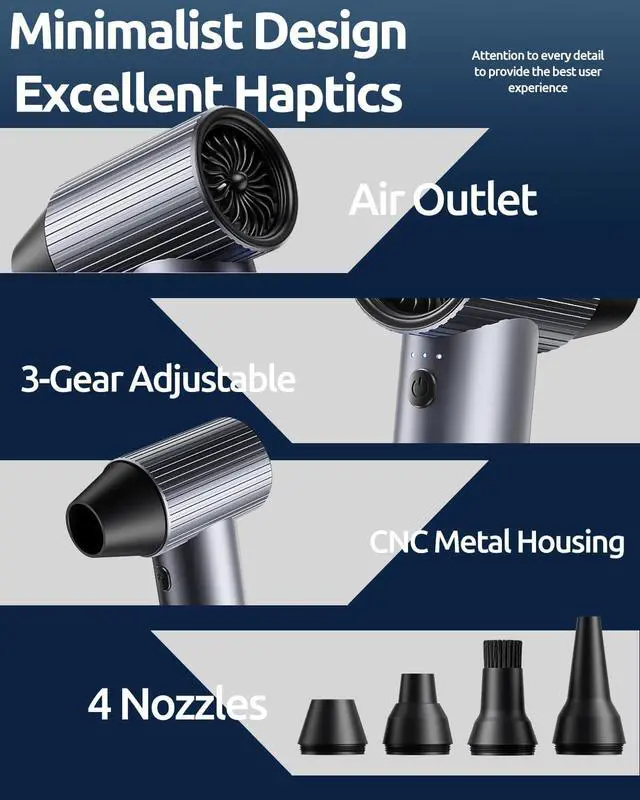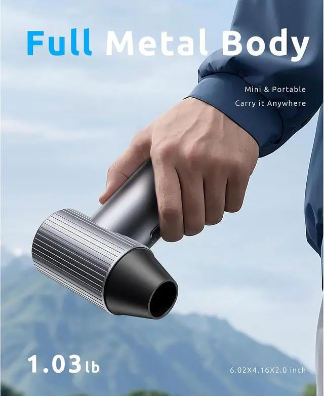 ROBUST FULL-METAL CONSTRUCTION -- Crafted with heat-resistant, full-metal materials, this electric air duster combines durability with a modern design. It weighs just 1.03 lbs and measures only 5.4 x 3.2 inchescompact enough to carry anywhere. The ergonomic, non-slip grip ensures a secure and comfortable hold, ideal for home, office, or travel use.
