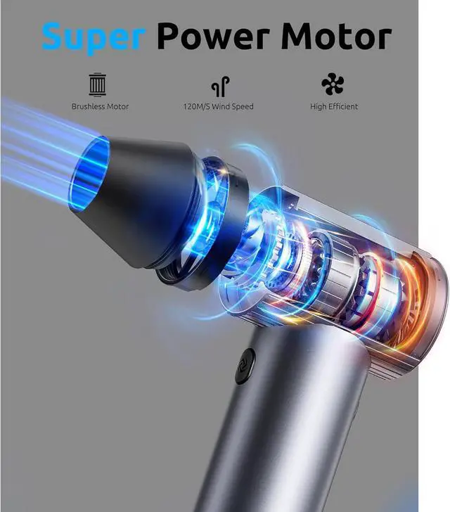HURRICANE-LEVEL X7 MINI BLOWER -- Featuring a high-efficiency brushless motor, the cordless X7 mini blower reaches an incredible 300,000 RPM and delivers airflow speeds of up to 120 m/scomparable to a Category 5 hurricane. With a powerful 300G blowing force, it effortlessly eliminates dust, debris, and moisture, making it the ultimate electric duster for heavy-duty cleaning tasks.