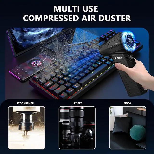 Alternative to Compressed Air:Compared with compressed air tanks, our air dust collector is more environmentally friendly and energy-saving, the cordless blower can be recharged and used repeatedly, no liquid or ice will be formed during the cleaning process, and your electronic equipment is protected from liquids.