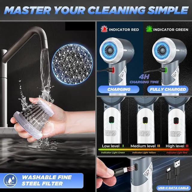 Practical accessoriesThe cordless car vacuum cleaner includes the following accessories:Floor brush*1, Stainless steel filter screen*1,Air extraction nozzle*1, Short blowing nozzle*1,Flat suction brush*1,Long flat suction*1,Pipe blowing round brush*1,Long blowing pipe*1,Small and large inflator nozzle,Storage bag*1,USB charging cable*1. Rich accessories can make your life more convenient.