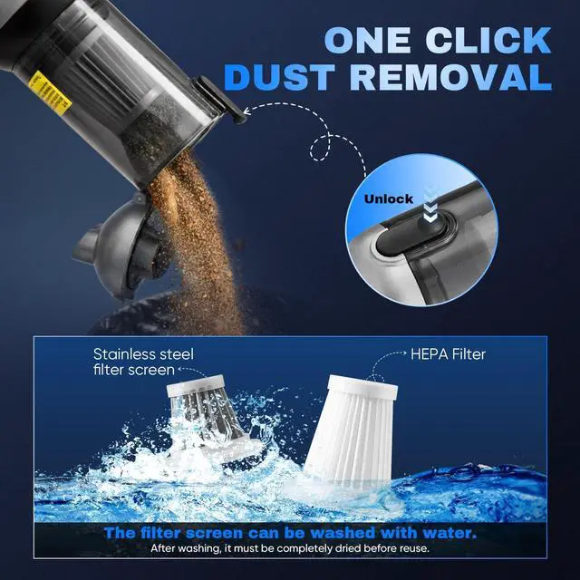 One-Touch Dust Disposal DesignEmpty the dustbin in seconds with the single-button release. The compact design makes this Saker Mini Vacuum Cleaner ultra-portable and easy to store in any glove box or drawer.