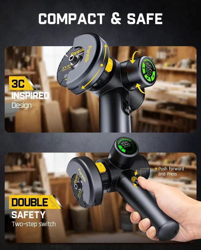 Dual Safety System: Exclusive 2-step Safety Switch and Guard Design. Auto-stops when released, no manual unlock needed. Cutting guard with aluminum grinding shield. Built-in Safety: Push forward & Press, 2-step to start machine, total control for your every cut