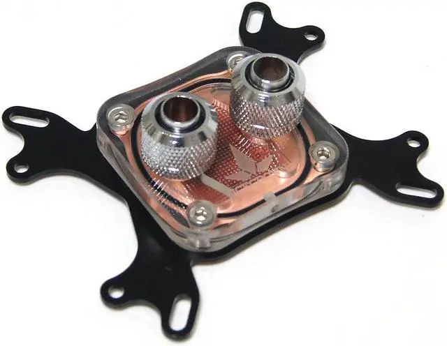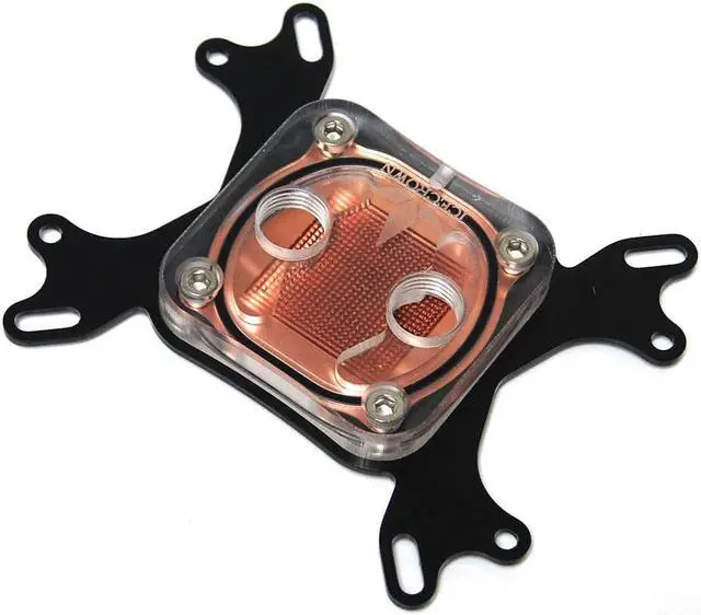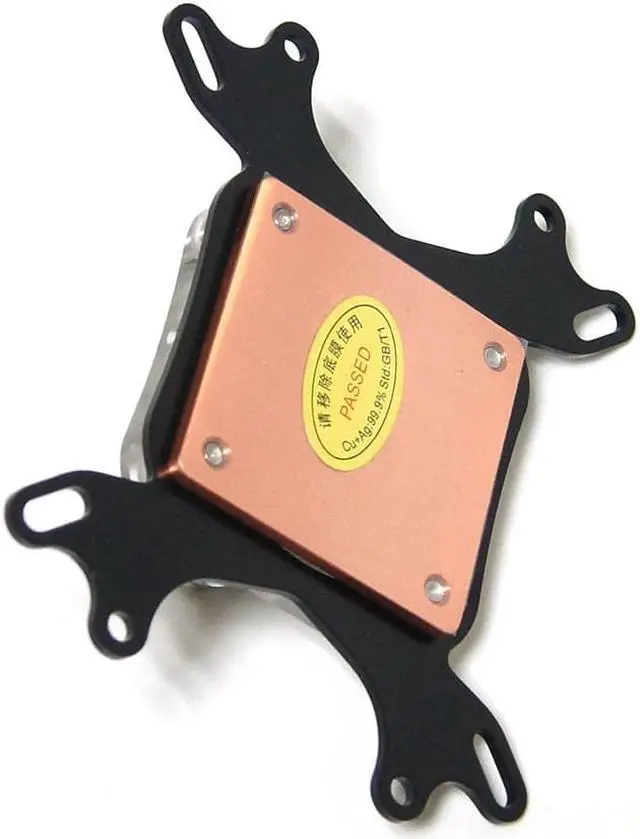 It has two chrome plate copper faucets. The external diameter is 10 mm. The height of the copper base is 5 mm. It has inner water channel. The water contact area is large, thus to carry more heat from the CPU quickly.