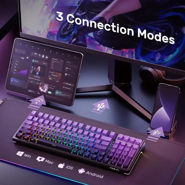 Mechanical Keyboard Multi-Device Connection: AULA F98 keyboard wireless supports Bluetooth, 2.4GHz wireless and USB-C wired connectivity, which can be easily switched among 5 devices via shortcut keys or side keys. The creamy keyboard is suitable for applying to various environments such as home, office, outdoor, etc! It can meet most user's needs. 4000mAh large-capacity battery, long battery life, no need to change/charge the battery frequently