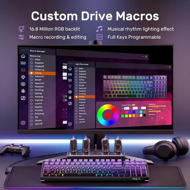 Gaming Keyboards 16.8 Million RGB Backlit: This light up keyboard features brilliant RGB lighting effects. 16 preset lighting effects add great ambiance to your games. The Driver supports 10 cool music rhythm lighting effects. Lighting brightness and speed can be adjusted FN+ key mix, create unique lighting setups to liven up your keyboard and gaming scenes