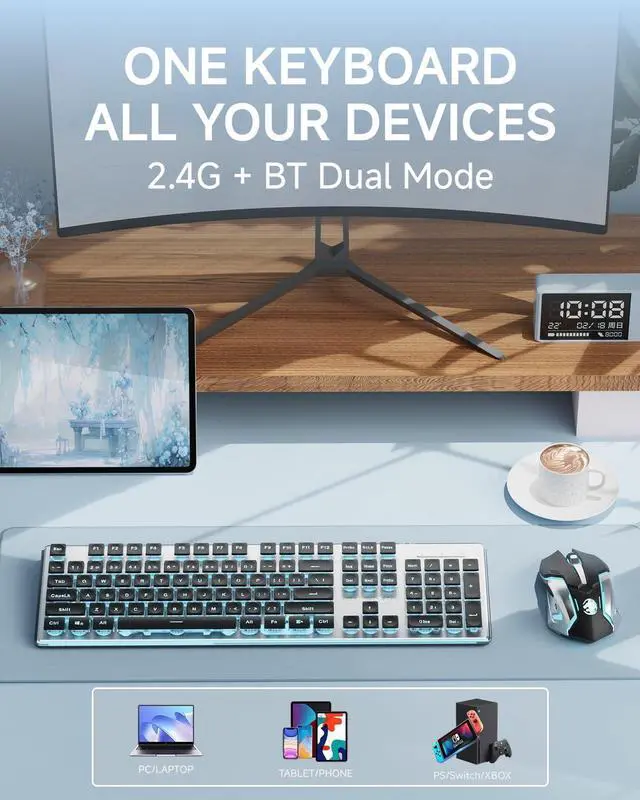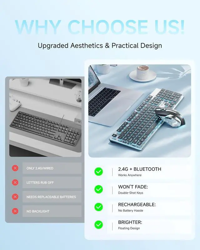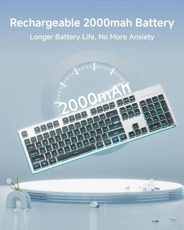 Upgraded Water Drop Keycaps & Less Noise: Full size keyboard wireless uses upgraded suspended water drop keycaps with great light transmittance. The surface of the keycaps concave and convex design, which fits your fingertips well, typing or gaming more comfortable and easier. Also quieter, reducing typing noise by 95%. With wireless silent mouse, you no longer worry about noise disturbances in the library, cafe, office or dormitory
