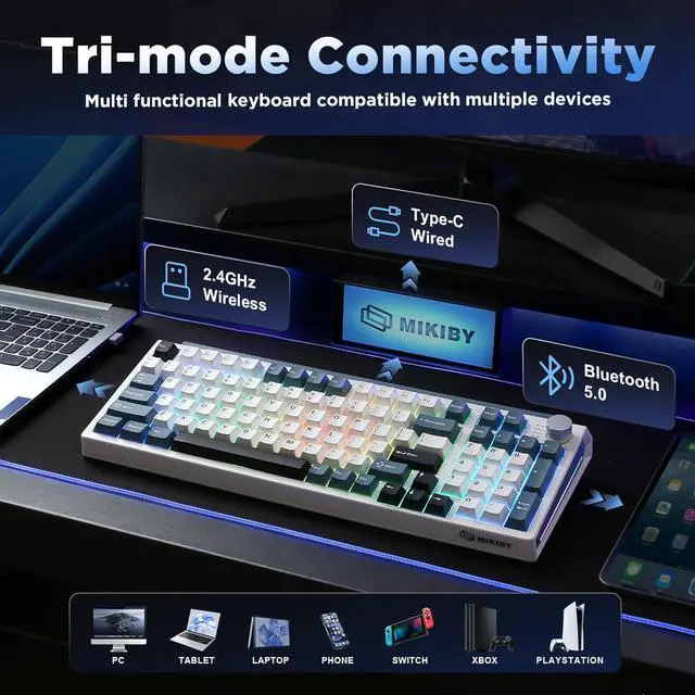 Tri-Mode Connection Keyboard: This wireless mechanical keyboard supports Bluetooth 5.0,2.4GHz wireless, and USB-C wired connectivity. It can connect to up to 5 devices simultaneously, Bluetooth keyboard compatible with PC, laptops, tablets, phones, PS5, Xbox, and more. Works with Windows & Mac, this keyboard offers versatile connectivity to meet all your work, gaming, and study needs
