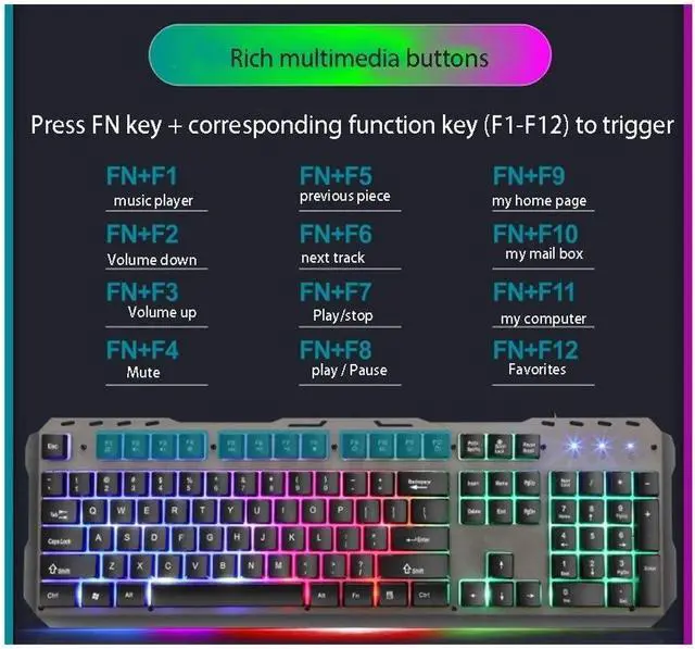 Keyboard With rich multimedia keys, press FN key + corresponding function key (F1-F12) to trigger, let you enjoy the function of each key