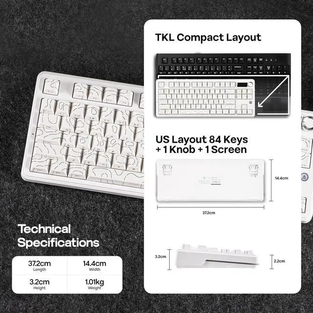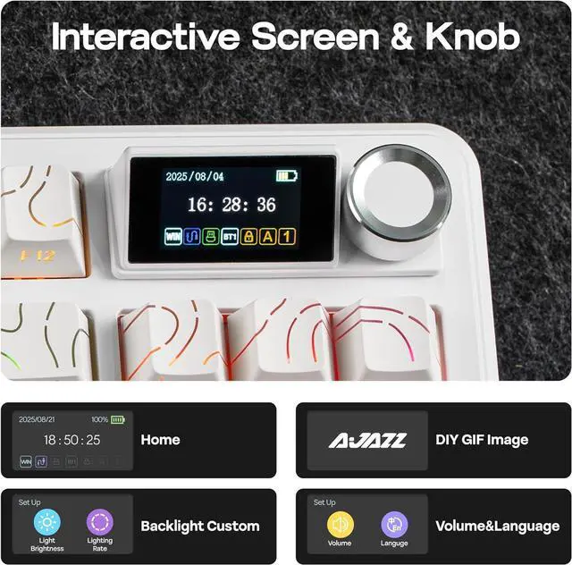 Functionality Options: Screen vs. Keys The AJAZZ AK870 V2 is offered in two styles: one variant features three function keys without a screen, while the other includes a hot-swap screen and knob module. Function keys version provides Prtsc, Scrlk and Pause, which include quick screenshot capture, toggling scrolling functions, and pausing processes for better control. And the 1.06 TFT display allows users to customize visuals, monitor battery status, view date and time, check connectivity and OS data, and adjust backlighting effects.