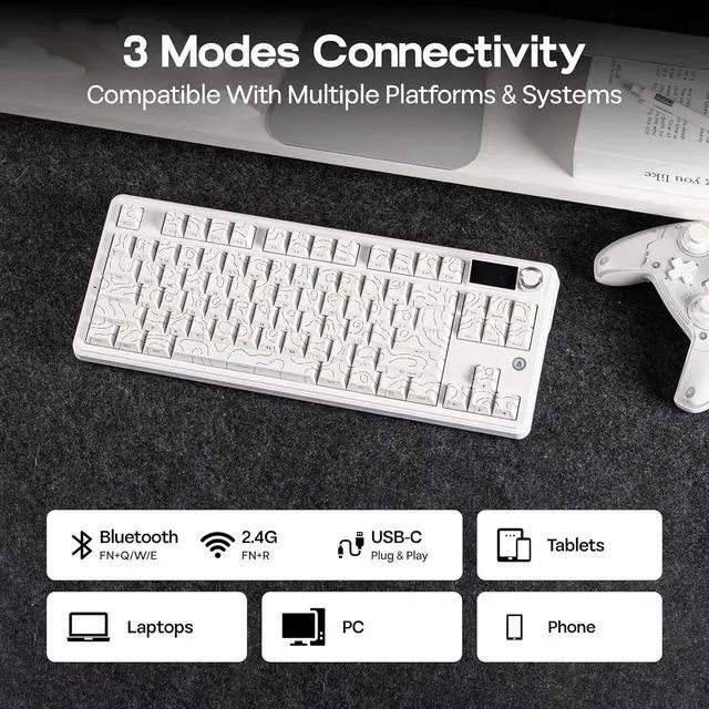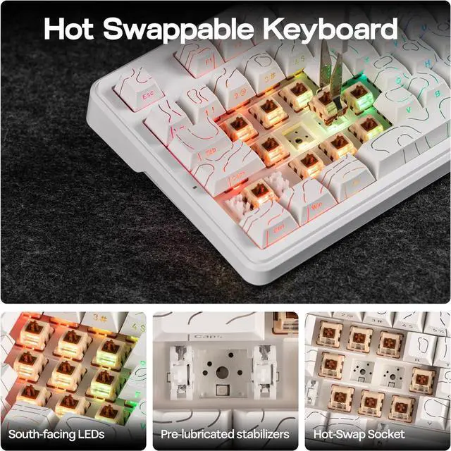 Powerful 10000mAh Battery & Triple Connectivity Modes Featuring a substantial 10000mAh battery, the AK870 V2 keyboard allows for long gaming sessions without fear of running out of charge. This wireless keyboard connects via Bluetooth 5.0, 2.4GHz wireless, or USB-C, offering flexibility for playing games on different devices. The ultra-responsive and low-latency connection makes sure each keystroke is visually captivating and promptly detected, whether you are deeply engaged in gaming or working on your typing tasks.