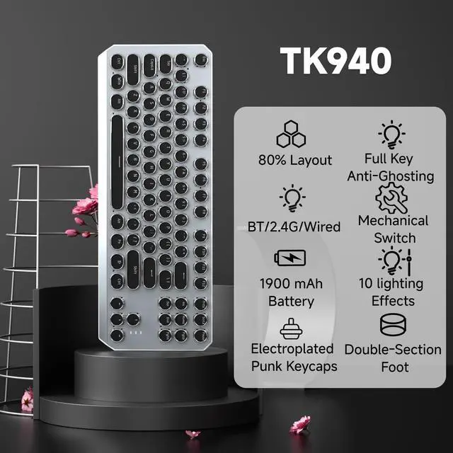 Metal Panel and Electroplated Punk Keycaps:The retro typewriter keyboard wireless panel is made of top-grade aluminium alloy, with a metallic matte texture, sturdy and robust enough to protect it from scratch. The floating keycaps are carefully crafted using metal plating technology, with a unique monochromatic light that instantly makes your keyboard look stunning, and enhances the feeling of the wireless backlit keyboard.