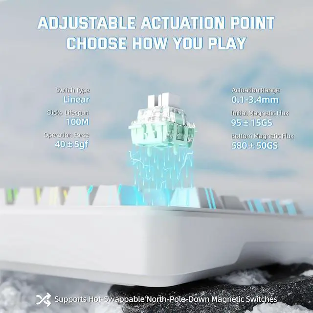 Adjustable Actuation PointEvery keys Hall switch is custom-tuneable from 0.1 mm to 3.4 mm in 0.01 mm increments via the browser-based driver, so you can optimise for rapid gaming bursts or ultra-precise typingthen save your profiles straight to onboard memory.