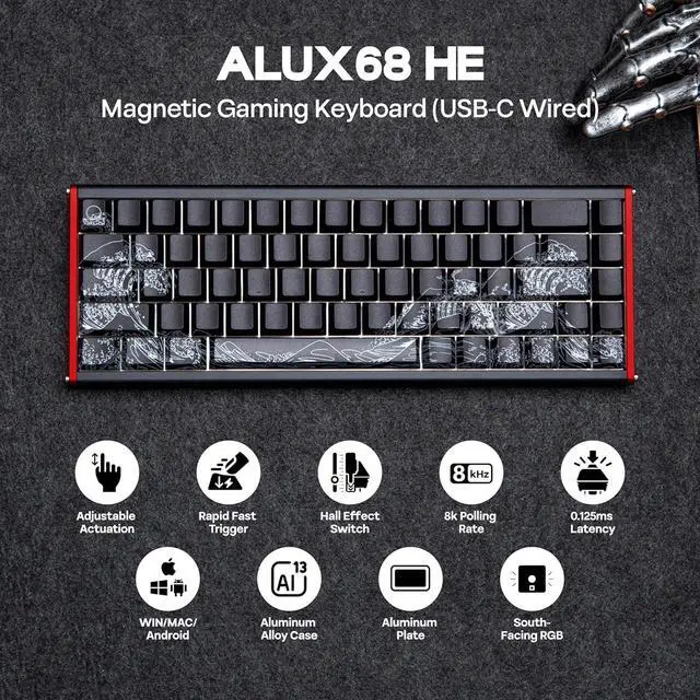 Durable Aluminum Alloy Design The AJAZZ ALUX 68 HE Series features a robust CNC-Anodized aluminum alloy casing with 180 mesh sandblasting, offering a premium look and feel. This durable material ensures longevity while enhancing the overall aesthetics of the keyboard. The metal construction contributes to the keyboard's stability and reliability, making it ideal for intense gaming sessions.