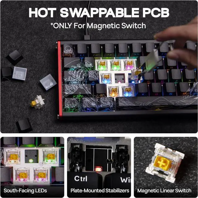 Magnetic Switch Technology Equipped with magnetic switches, the ALUX 68 gaming keyboard offers superior durability and responsiveness. These switches deliver a smooth keypress experience with 0.01mm accuracy, making it perfect for gamers who require precision and consistency. Additionally, these switches have a long lifespan of over 100 million keystrokes.