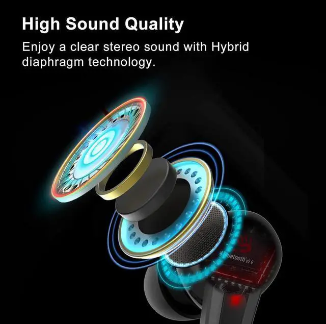 Premium Sound, Clear Call - With Hybrid Diaphragm Technology, this wireless earbud can offer you a clear stereo sound. And ENC noise canceling technology can effectively reduce background noise during calls, and make calls clearer.