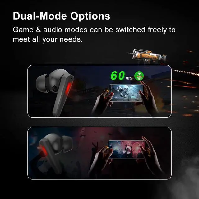 Dual-Mode Options, Waterproof Design - Game & music dual-mode design, freely to switch, just need to touch the right earbud 3 times, you can enter the "game/music mode" prompt. Meet all your daily needs. IPX4 waterproof resistant, can protect your earbuds from splashes.