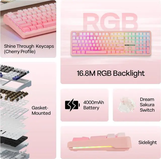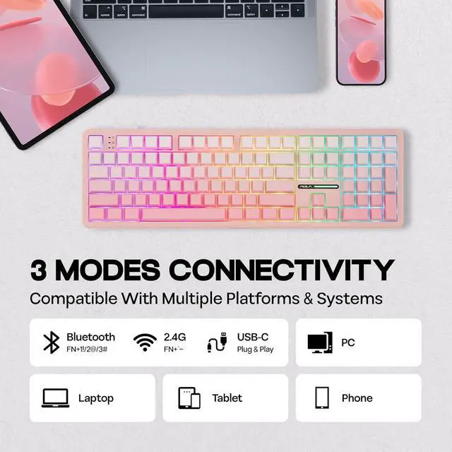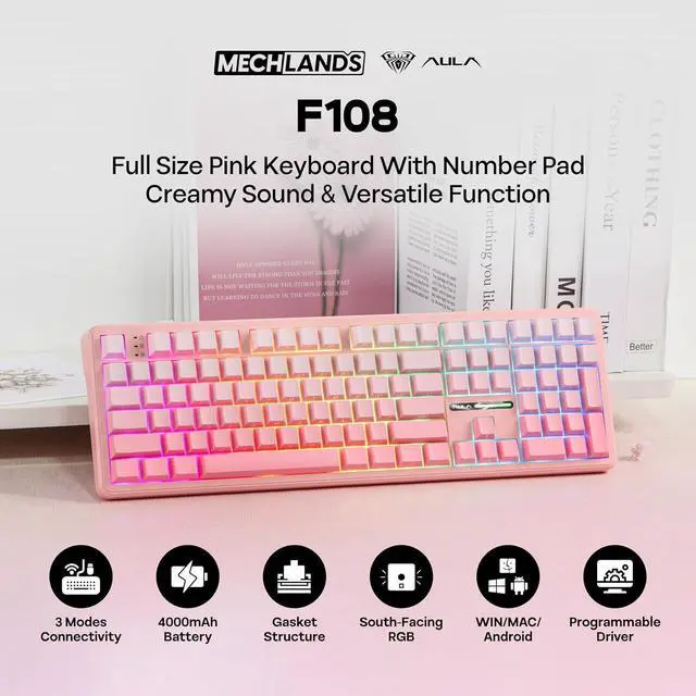 3 Modes Wireless & 4000mAh BatteryEquipped with an impressive 4000mAh rechargeable battery, the F108 wireless keyboard delivers double the power of typical gaming keyboards, enabling up to 100 hours of uninterrupted gameplay without backlights. Its adaptable Bluetooth mode allows for quick switching between PC/laptops/tablets and Win/Mac, while the 2.4GHz wireless and USB cable options ensure high-level stability and responsiveness with a 1000Hz polling rate.
