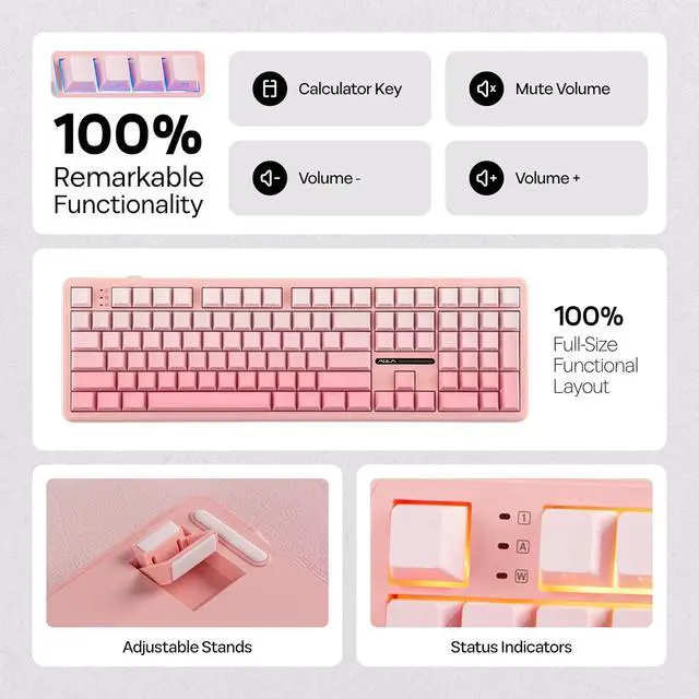 100% Layout for Work & GameOffering the same smooth acoustics and outstanding functionality as the F75, the F108 is a full size mechanical keyboard designed with an improved layout. Its 108 anti-ghosting keys provide superior accuracy and flexible control options, making it well-suited for multitasking and fast-paced gaming or office environments. Plus, the ergonomic two-stage kickstand, reduced front height, and cherry profile keycaps minimize finger fatigue and wrist discomfort, ensuring a pain-free working experience.