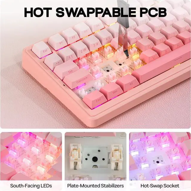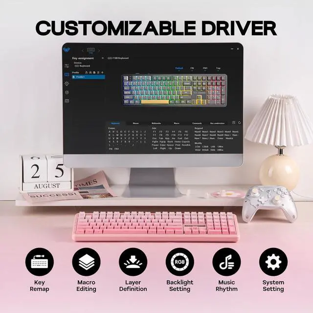 Hot-Swappable Custom KeyboardWith the exceptional setup of the F108 custom keyboard, you can tailor the feel of each keystroke, its acoustic feedback, and the functions they perform. Experience the various typing dynamics provided by standard 3/5-pin mechanical switches through the F108s hot-swappable capability, and delight in the smoothness of our pre-lubed linear switch that delivers a creamy sound, aided by the keyboard's sound-dampening features. Take advantage of the powerful programming software for key remapping, macro creation, and sensitivity tuning to improve your typing efficiency, gaming skill, and accessibility.