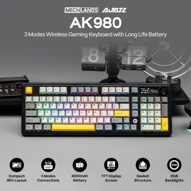 Enhanced Battery Life with South-Facing LED Light up your typing experience with the AJAZZ AK980's south-facing LED, paired with an impressive battery: 8000mAh(with Screen)/4000mAh(without Screen). This design ensures bright, consistent backlighting of the keys without the overshadowing common in north-facing setups, providing long-lasting illumination and visibility through even the longest work sessions.