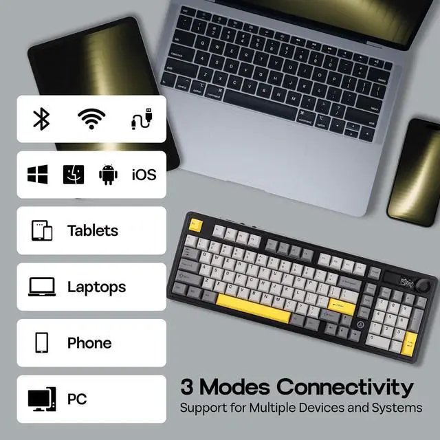 Triple Modes Connectivity The AJAZZ AK980 wireless keyboard elevates your typing experience with its versatile triple modes connectivity. Whether you're at home, in the office, or on the go, seamlessly switch between Bluetooth, wireless, and wired connections. This flexibility ensures that you can stay productive and connected, no matter where you work from.