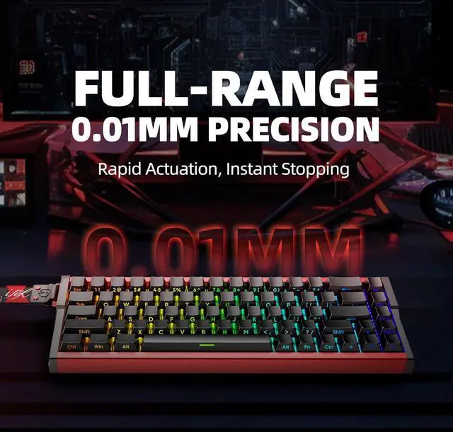 Customizable Keystrokes Travel&O.125MS low Latency: MG68 Max magnetic keyboard each key can be 0.01mm accurate, polling rate 8KHZ, with customizable keystrokes travle from 0.01mm to 3.5mm, and the delay can be as low as 0.125ms, achieving a zero-perception latency experience,matching the keystroke needs of different games. This magnetic switch has a trigger force of 35±5GF and a service life of approximately 100 million times.