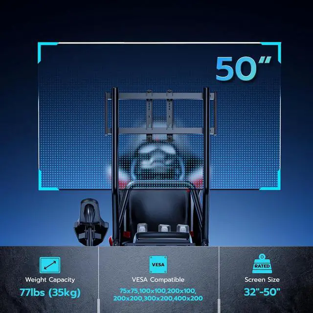 Supports 32 to 50 ScreensARES WING racing sim monitor stand is compatible with monitors from 32 to 50 in size, handling weights up to 77 lbs. Compatible with most VESA patterns including 75x75, 100x100, 200x100, 200x200, 300x200 and 400x200 for flexible TV mounting options.