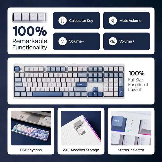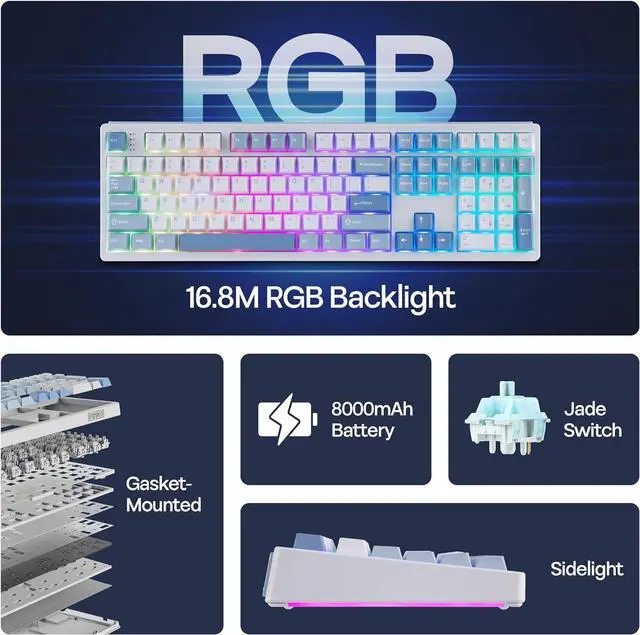 Extended-Use Wireless Keyboard Elevate your workspace with a stable wireless keyboard equipped with a powerful 8000mAh battery. This tri-mode keyboard allows for free movement and reliable performance, eliminating cable interference and enabling seamless switching between five connected devices via wired, 2.4GHz, and Bluetooth options. Compatible with PCs, Mac laptops, Android tablets, and gaming consoles, its 160-hour battery life means you'll never need to interrupt your gaming experience for a charge.