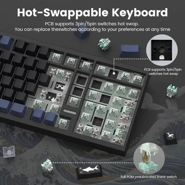 Hot-Swappable Keyboard & Pre-lubed POM Switches Hot swappable mechanical keyboard is equipped with RK's customized Pre-lubed linear POM switches, which have fast response and long keystroke life. PCB supports 3pin/5pin switches hot swap. You can replace the switches according to your preferences at any time.