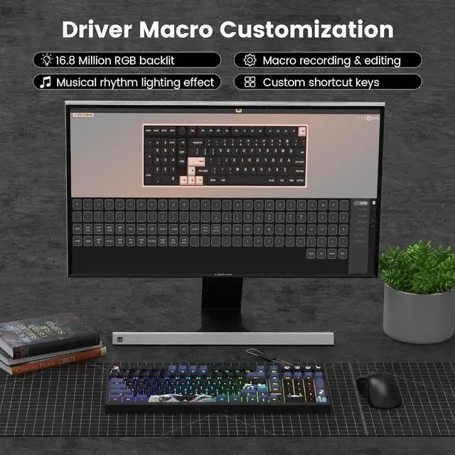 PBT Keycaps & 98% Layout Side-prined PBT keycaps which are more durable without fading, sweat-proof, and softer to the touch. This keyboard is designed to be light-transmissive on three sides based on the original side-engraved keycaps, making the entire backlight brighter. 96% layout compact keyboard can save more desktop space while keep necessary arrow keys and number area for games and work.