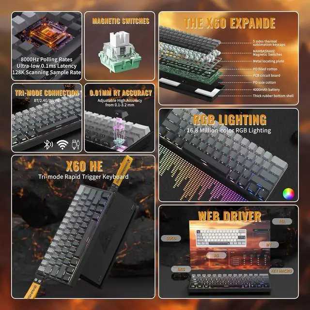 Hot-Swappable & 16.8M Color RGB BacklightThe X60HE magnetic keyboard features 61 keys with 60% compact layout, equipped with hot-swappable switch design(compatible with all south-facing N-pole switches), letting you customize feel and sound. Combined with 16.8M-color RGB lighting and wear-resistant PBT side-printed keycaps, it boosts aesthetics while making your setup uniquely yours.