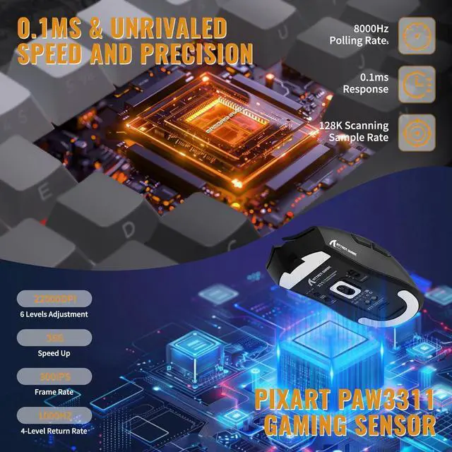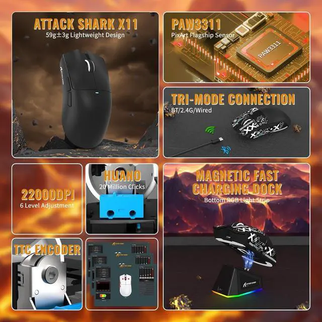 Professional 62g Ultra-Light MouseATTACK SHARK X11 Wireless Gaming Mouse is equipped with a PAW3311 optical sensor, offering 66 adjustable DPI (800-1600-2400-3200-5000-22000), 300 IPS tracking speed,1000Hz response speed,35G acceleration limit. Weighing just 62g, its featherlight design ensures effortless portability, so you can game anywhere without the bulk. Built with HUANUO micro switches rated for 20 million clicks, its durable enough to dominate every match.