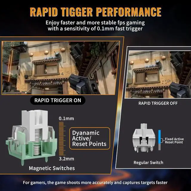 Rapid Trigger Hall Effect KeyboardThe MAMBASNAKE X60HE features advanced adjustable Hall Effect magnetic switches with 0.01mm RT adjustable accuracy, ensuring every keystrike is swift and accurate. Customize actuation points from 0.13.2mm, paired with an 8000Hz polling rate and 128K scan rate for an ultra-low 0.1ms delay. With dynamic key response and rapid-trigger technology, the X60HE delivers unmatched speed and adaptabilityperfect for FPS, Valorant, and CS:GOgiving you the edge to strike first.