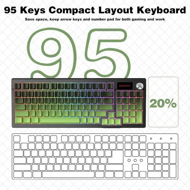 [Tri-mode Connection Keyboard]: Kutethy KY95 wireless mechanical keyboards work with Bluetooth, 2.4GHz wireless and USB wired connection,can connect up to five devices at the same time and easily switch by shortcut keys or side button. KY95 computer keyboard is suitable for PC, laptops, tablets, mobile phones etc. In addition, the rechargeable keyboard is equipped with a 4000mAh large-capacity battery, which has long-lasting battery life
