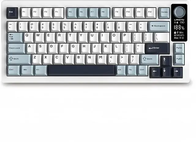 75% COMPACT KEYBOARD WITH KNOB & LCD-SCREENLT75 mechanical keyboard with LCD-screen is an interactive interface with a screen that displays battery status, connection mode, connection system, and is equipped with a metal knob to control the volume. This 80-key tkl gaming keyboard and cream color scheme strikes the perfect balance between functionality and space-saving design