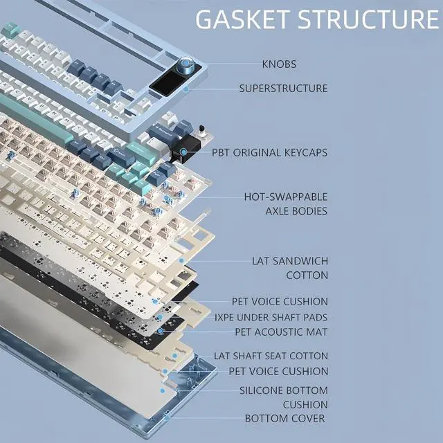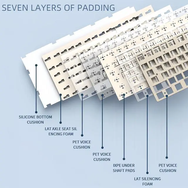 GASKET MOUNTED & PCB SINGLE KEY SLOTTINGThis thocky creamy keyboard features a gasket structure, exended integrated silicone pad, and PCB single key slotting, better optimizes resilience and stability, making the hand feel softer and more elastic. Seven layers of filling silencer fills the gap between the PCB, the positioning plate and the switches, effectively counteracting the cavity noise sound of the switch hitting the positioning plate, providing flexible performance beyond the metal, more comfortable typing and better light transmittance