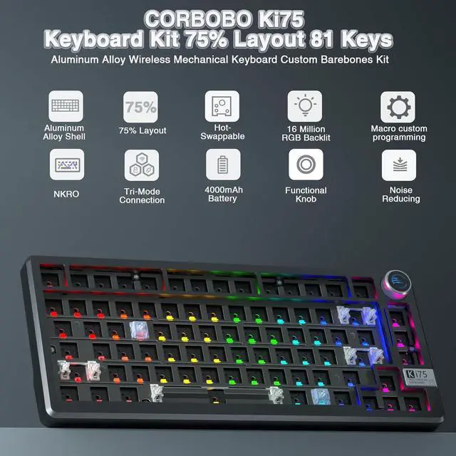 75% Arrangement, 81-Key Layout: The CORBOBO KI75 Keyboard Kit, 75% layout with 81 essential keys, keyboard features a gasket structure. It incorporates a transparent PC mounting plate, and a bottom-mounted flexible cotton pad, etc, a total of 5 layers of luxurious filling.(Without keycaps and switches)