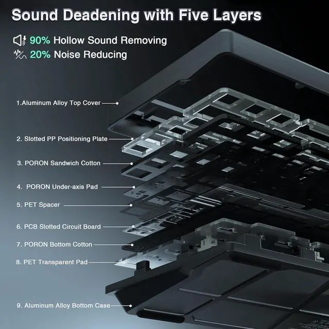 Innovative Gasket Mount: Featuring an advanced design paired with PORON, this keyboard dramatically reduces cavity resonance, delivering a refined and premium typing sound. With a five-layer sound-dampening structure, it eliminates 90% of hollow echoes and reduces noise by 20%, ensuring a quieter and more satisfying typing experience. Perfect for both office and gaming environments, its the ultimate choice for those seeking a low-noise, high-performance mechanical keyboard