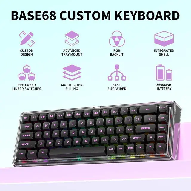 Premium Crystal-Clear Durability Crafted from high-transparency PC via precision one-piece injection molding, the Base68 wireless keyboard resists yellowing and delivers 8-10x greater impact resistance than acrylic - critical for intense gaming keyboard sessions. Its polished, non-frosted finish ensures breathtakingly vibrant RGB lighting and keyboard color fidelity.