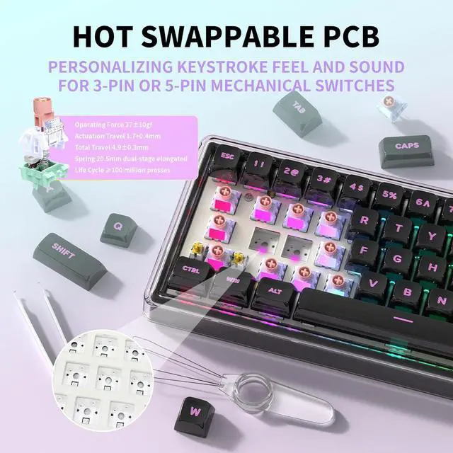 Kailh Exclusive Custom Lulu Switche Base68 mechanical keyboards equipped with pre-lubed linear switches, bring smooth typing feeling and pleasant typing sound, provide fast response for exciting game. This customizable keyboard with hot-swap allows users to replace 3 pins/5 pins switches easily without soldering issue.