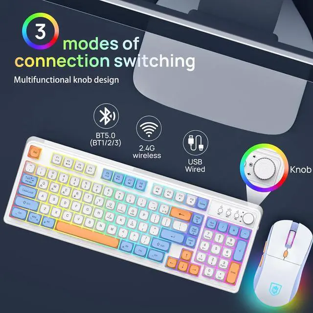 Triple Modes Keyboard and Mouse ConnectionBT98 Wireless Keyboard and Mouse both has three connection modes: Wired, Bluetooth, 2.4G Wireless, easily switch between 3 different devices, no longer limit the connection possibilities. Which can meet the connection of different devices.In addition,Our Keyboard Mouse includes 2 rechargeable USB-C cable for traditional Wired mode.