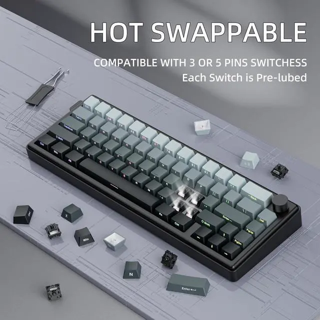 Hot-swap Custom Keyboard: This custom mechanical keyboard with hot-swappable base supports 3-pin or 5-pin switches replacement. Even keyboard beginners can easily DIY there own keyboards without soldering issue. KY65 gaming keyboards equipped with Gateron switches, bring smooth typing feeling and pleasant creamy mechanical sound, provide fast response for exciting game