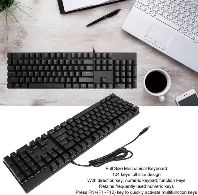 [FULL SIZE MECHANICAL KEYBOARD]: Features a 104-key layout with arrow keys, numeric keypad, and function keys, offering complete functionality for gaming and productivity needs. FN+(F1~F12) provides quick access to multifunction keys.
