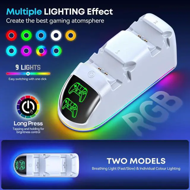 9 Dynamic RGB Lighting ModesThe RGB PS5 charger dock with touch control can switch lighting effect modes. It features fast or slow flashing light and single color light mode, This PS5 controller charger station create a fantastic atmosphere for your gaming room. Long press to toggle the lights on/offcreating an immersive backdrop that adapts to your play style.