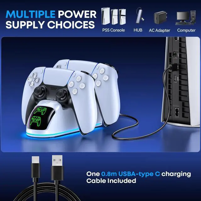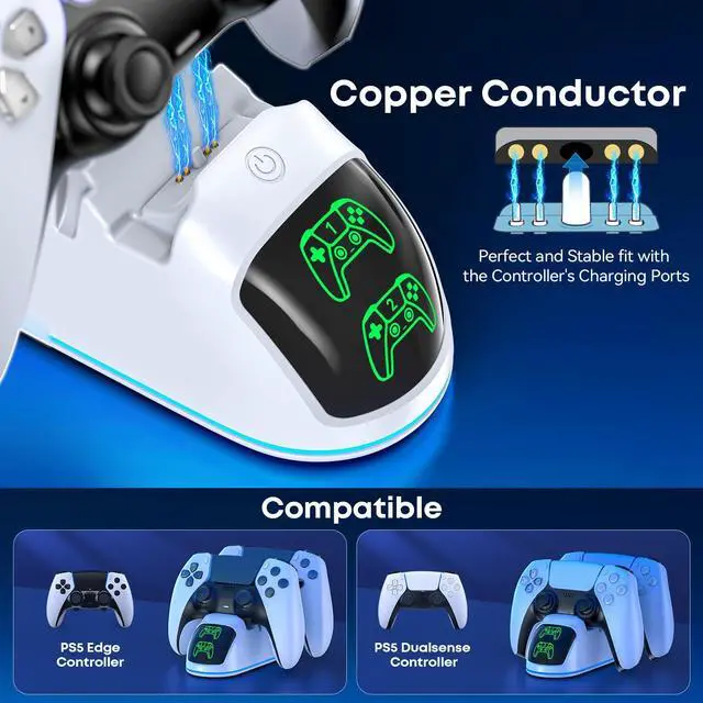 Compatible with Dualsense & Edge ControllerPS5 controller charger station exclusively designed for simultaneous charging of two PS5 Edge or DualSense controllers. space-saving design organizes your setup, reduces cable clutter, and neatly stores your controllersmaking it the ultimate all-in-one charging and storage solution for your PS5 controller charger accessories.