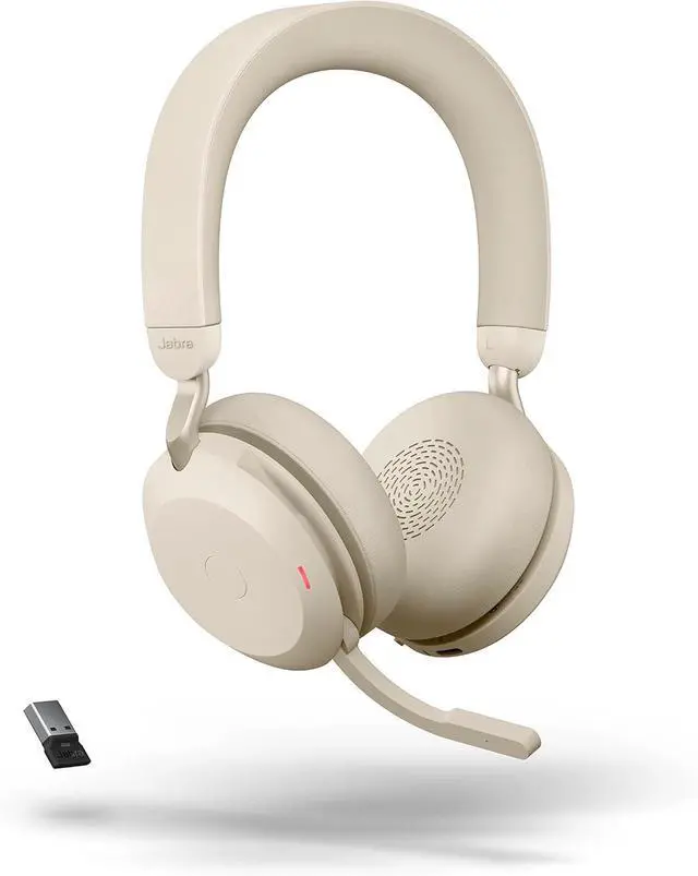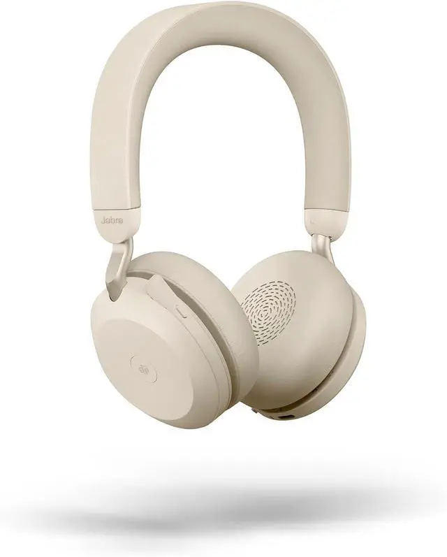 In the box: 1x Jabra Evolve2 75 Headphones, USB-A Link 380 Bluetooth Adapter and USB-A cable, Carry Pouch, Headset Weight: 197 g / 6.9 oz, Color: Beige. All in sustainable recycable packaging