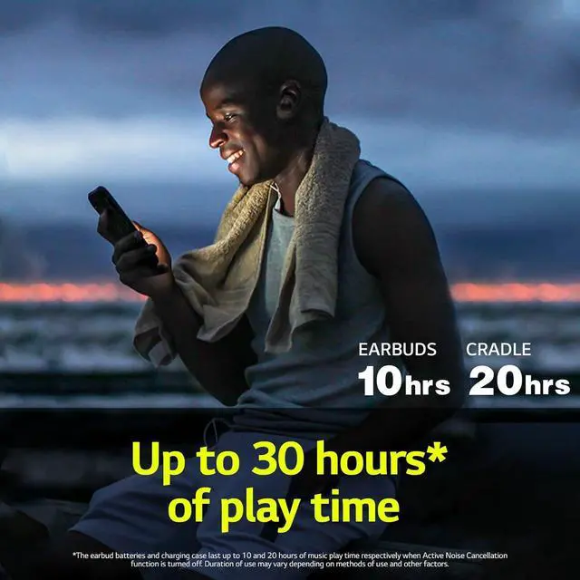 Get in (and stay in) the zone with LG's Hybrid Active Noise Cancellation technology that uses two mics to keep outside noise out.