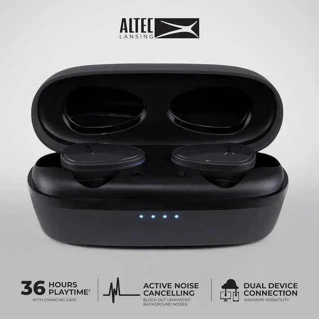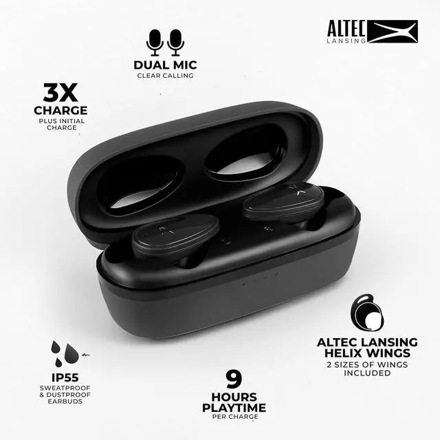 Engineered with a 0.25 driver and the new Realtek TRL8773EFE chipset, these sport earbuds deliver crisp audio and low-latency performance. Whether you're at the gym or on a run, the IP44 waterproof earbuds and full Altec helix wing ensure a secure, sweat-resistant fit. Enjoy 9 hours of playtime, and with the charging carry case, extend your total use to 36 hourswith fast charge capabilities giving you an hour of play from just 5 minutes of charging.